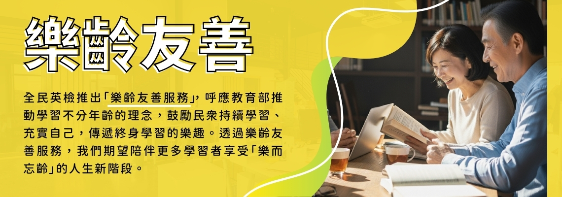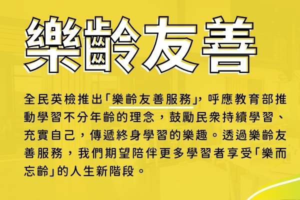 凡年滿 55 歲(含)以上的民眾報考測驗,即自動安排至全民英檢樂齡考場,與年齡相近的考生一起應試,共同創造舒適、友善的環境。