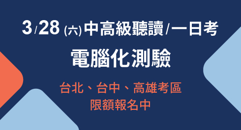 2026年3月28日中高級聽讀及一日考(電腦化測驗)報名中